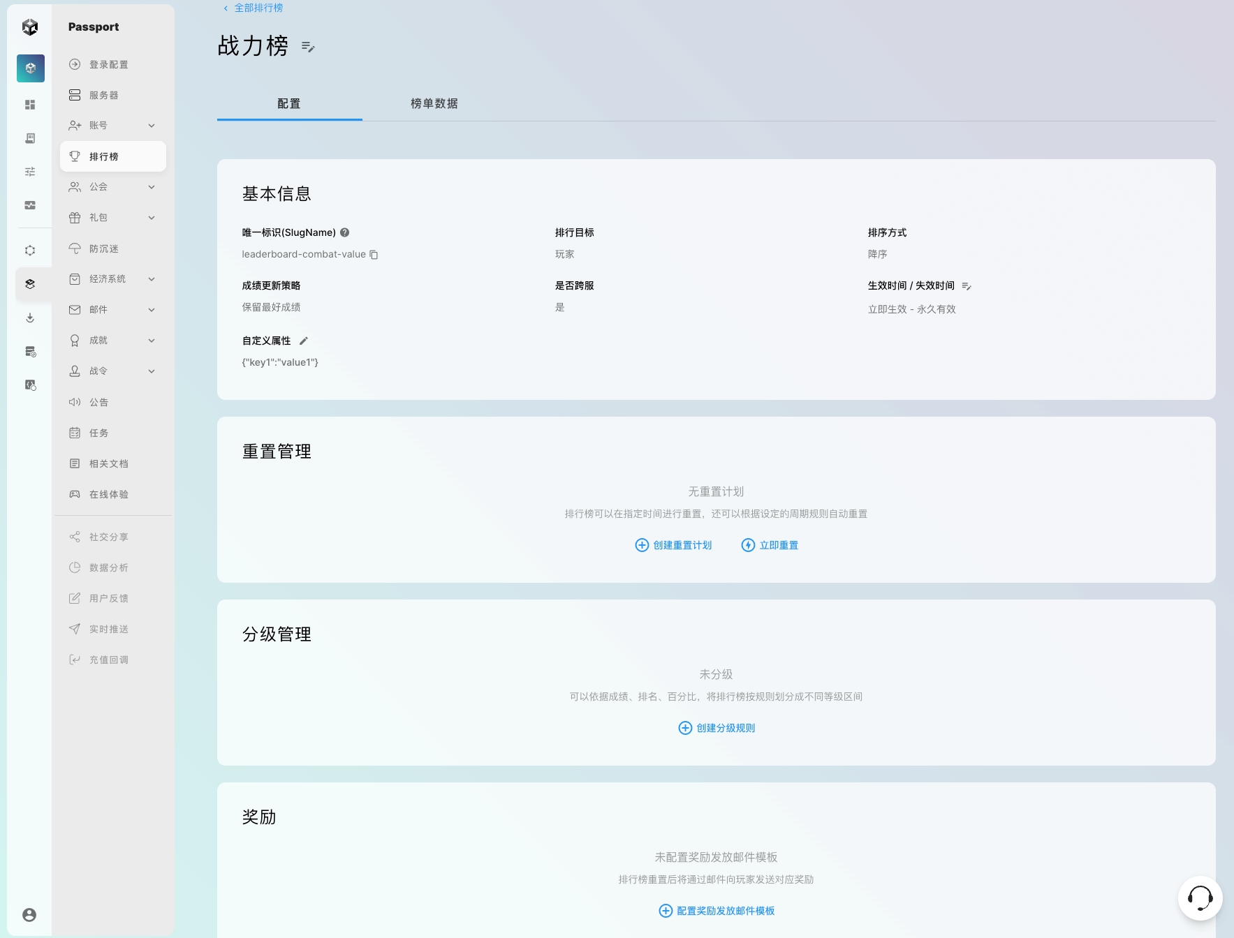 点击排行榜名称进入详情页,在此处你可以看到排行榜的基本信息,以及可以自行配置的“重置管理”、“分级管理”和“奖励”三个功能模块:
