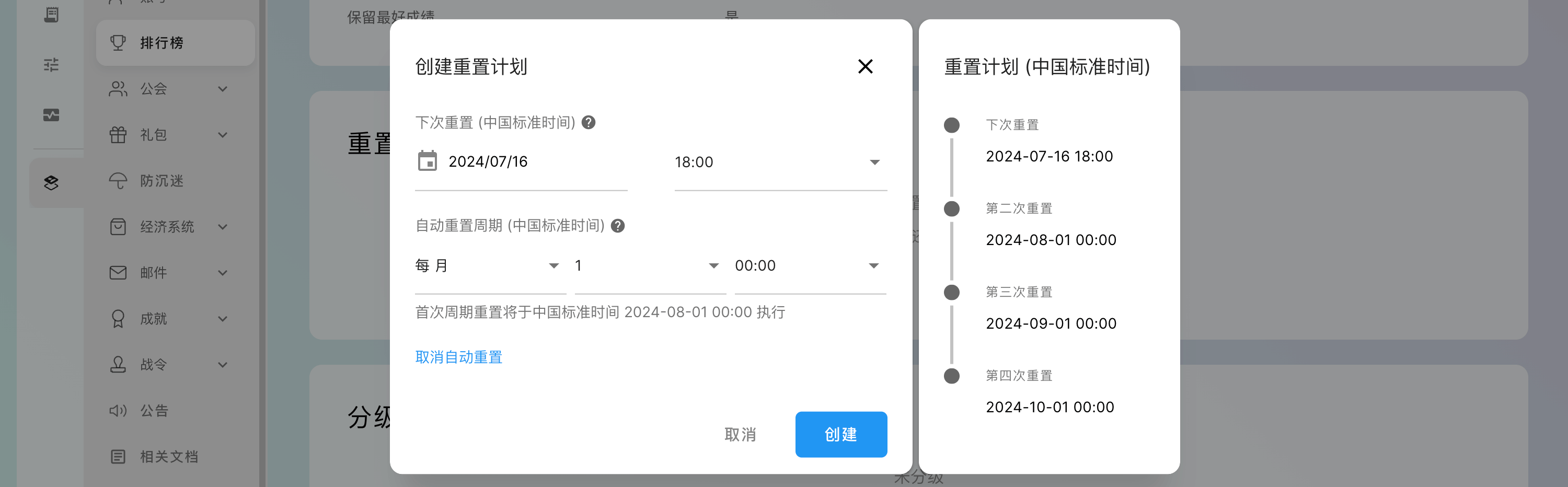 重置管理:用于控制排行榜的重置,重置后该榜单的所有数据清零,可以用于新开赛季等。分为“下次重置时间”和“自动重置周期”,其中“下次重置时间”的设定决定了排行榜将在该时间进行重置,而此时若是设定了“重置周期”,其第一次执行将在“下次重置时间”后的第一个周期节点执行。