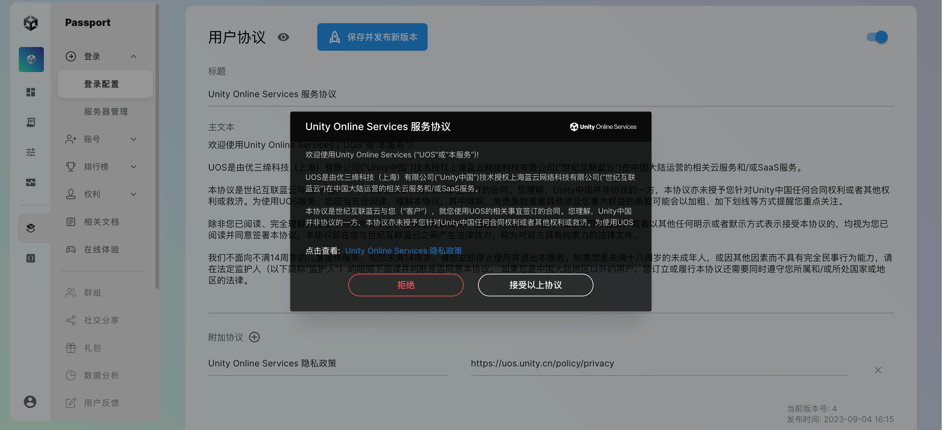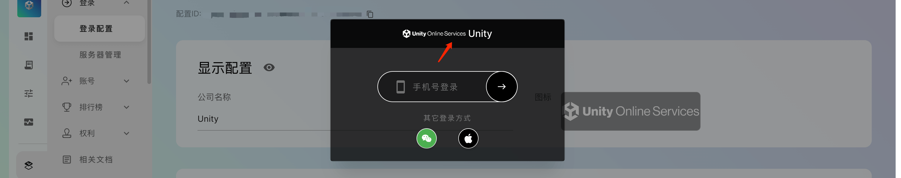 在这一版块,您可以尝试在 UOS 后台修改各功能模块的配置,看它们如何影响示例项目运行时的表现,从而进一步了解各个功能的工作原理。 支持 配置登录 信息,包括基本信息、登录方式、实名认证与用户协议等。 如需使用更多功能,请查看本教程相应部分: 配置好友、 配置排行榜、 配置公会、 配置礼包 和 配置防沉迷 。 具体流程如下: