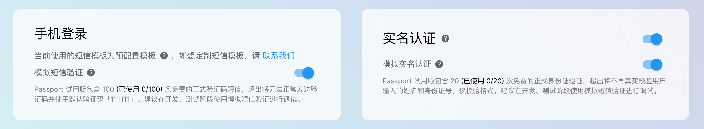 在此处开启模拟短信验证和模拟实名认证。开启模拟短信验证后,将不再发送真实验证短信,并使用默认验证码「111111」。开启模拟实名认证后,将不再真实校验用户输入的姓名和身份证号,仅校验格式。