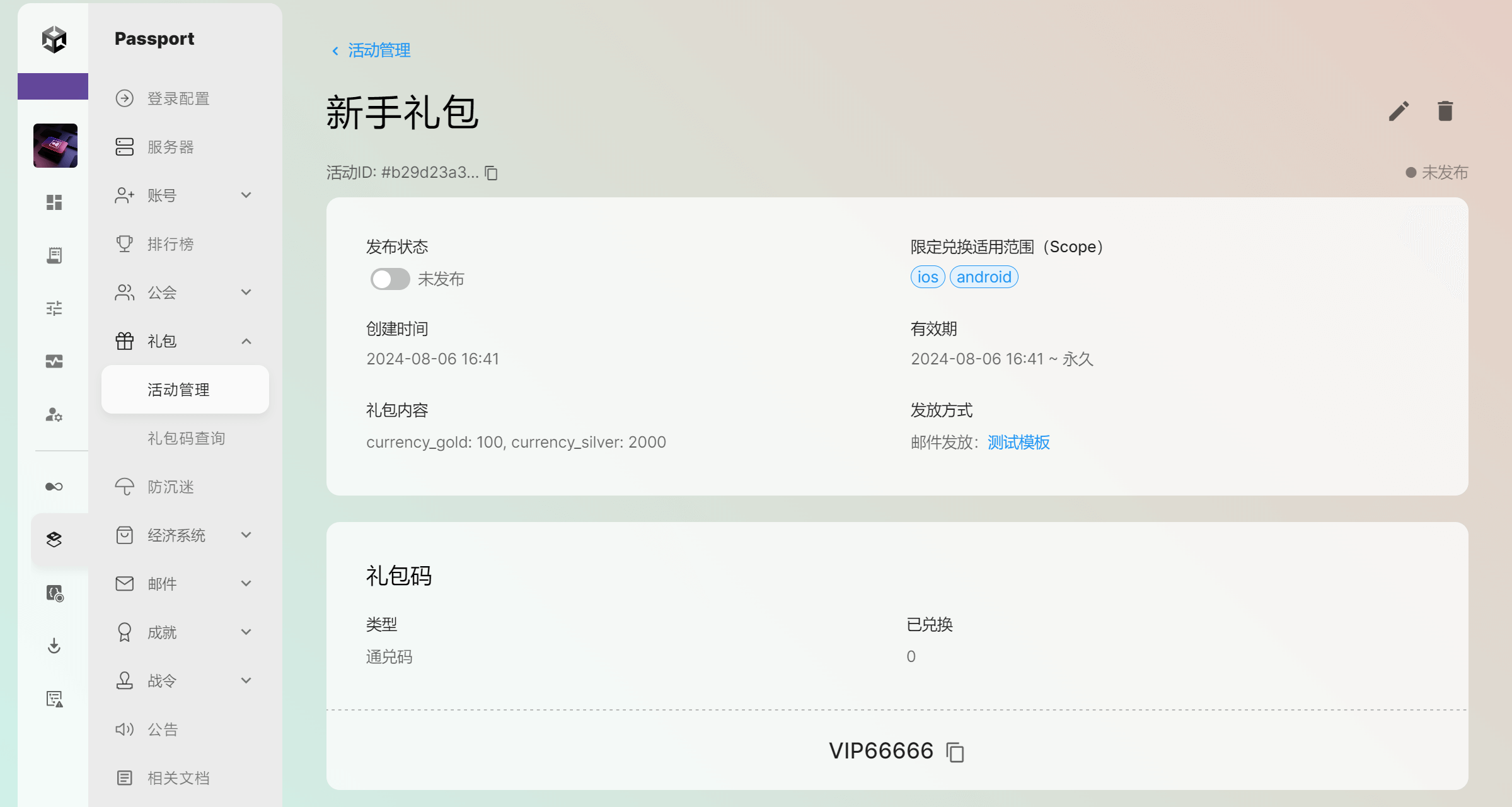 - 一个礼包活动只能有一个通兑码,所有玩家都可以使用该码兑换