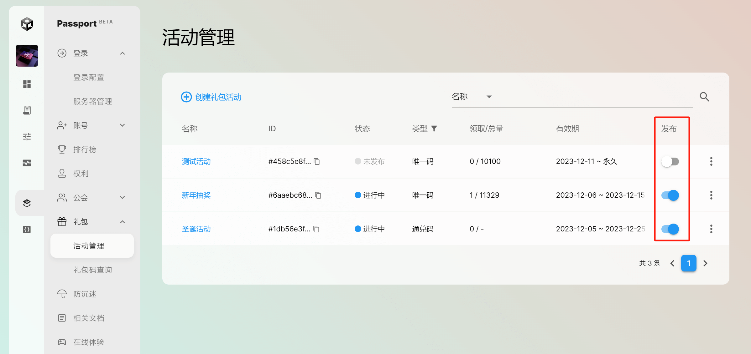 进入UOS Passport 「礼包 -> 活动管理」 页面进行礼包的配置与管理