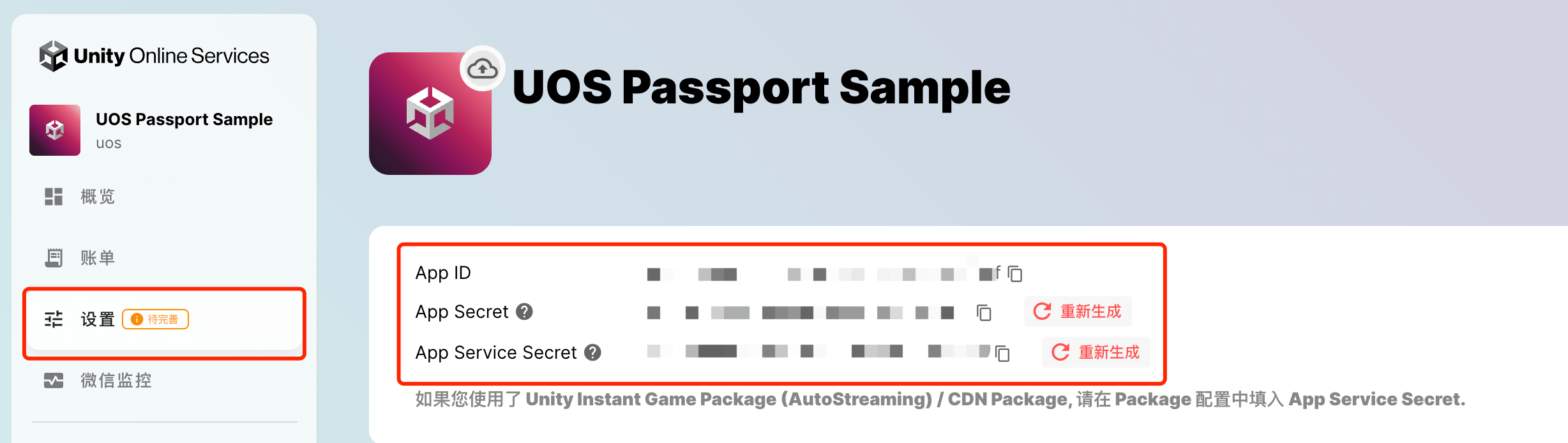 创建 UOS APP 并开启 Passport 服务的免费试用。开启服务后,将默认跳转到 Passport 配置界面。在设置中找到 App 信息,包括 App ID, App Secret 和 App Service Secret 以备在搭建 Unity 项目的过程中使用。