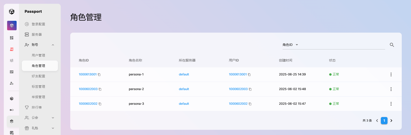 支持查看、搜索角色。点击角色ID可查看角色详情,支持为角色打标签、修改角色状态等操作,支持查看该角色在所有域(服务器)下的好友、排行榜、邮箱、成就、礼包和背包等情况。