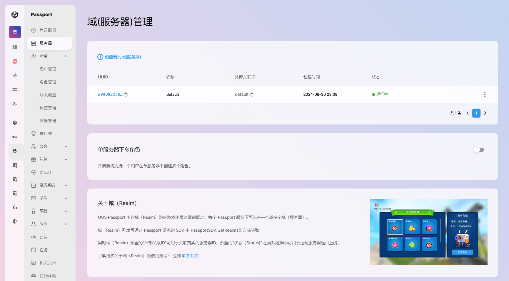 对应游戏中服务器的概念,每个 Passport 服务下可以有一个或多个域。 域(Realm)预置的"外部关联ID"可用于关联真实的服务器ID。