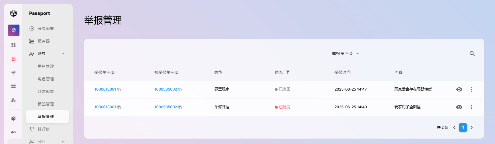 支持查询、查看举报详情、修改举报状态、删除举报记录、解封或封禁角色等操作。