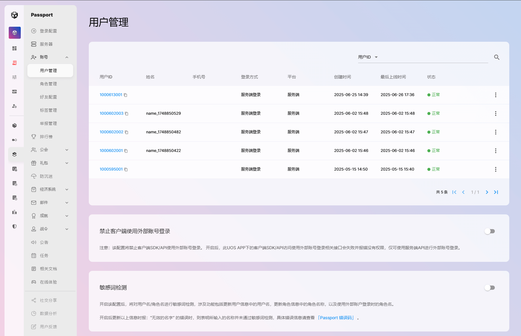 用户列表下面的敏感词检测模块,开启该配置后,将对用户名/角色名进行敏感词检测,涉及功能包括更新用户信息中的用户名,更新角色信息中的角色名称,以及使用外部账户登录时的角色名。