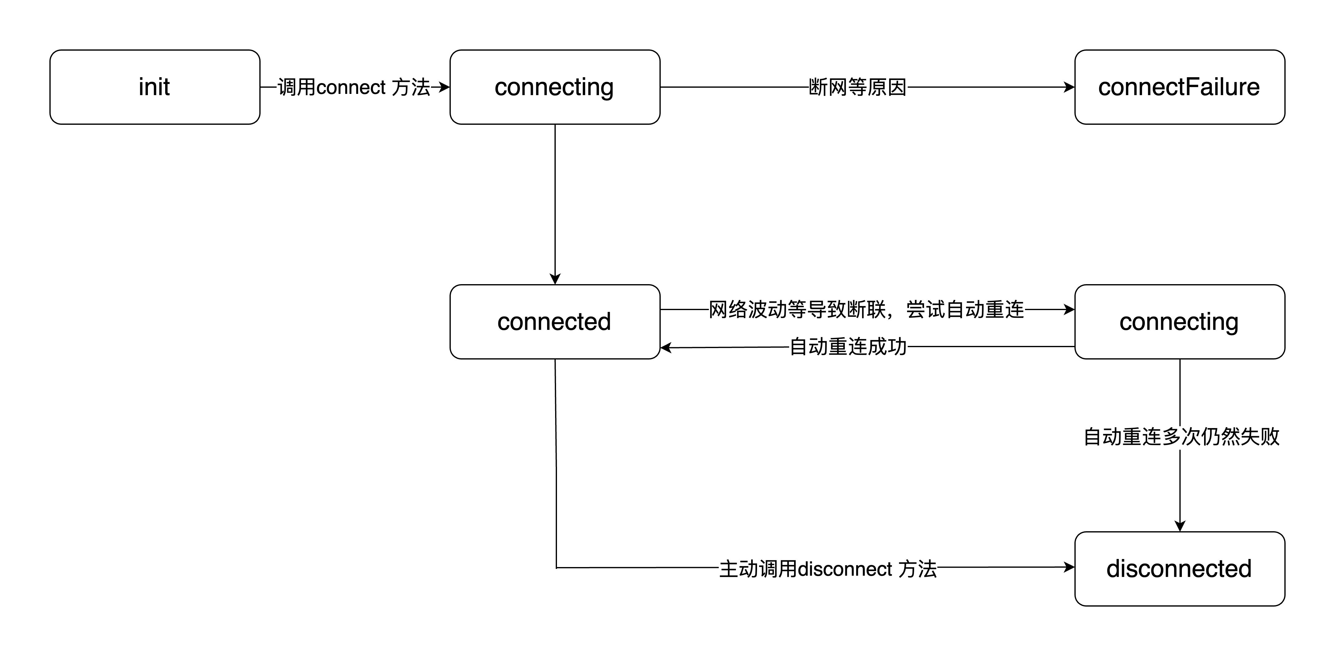 - disconnected (已断开连接): 客户端主动调用Disconnect方法或是断线重连失败后会处于该状态。