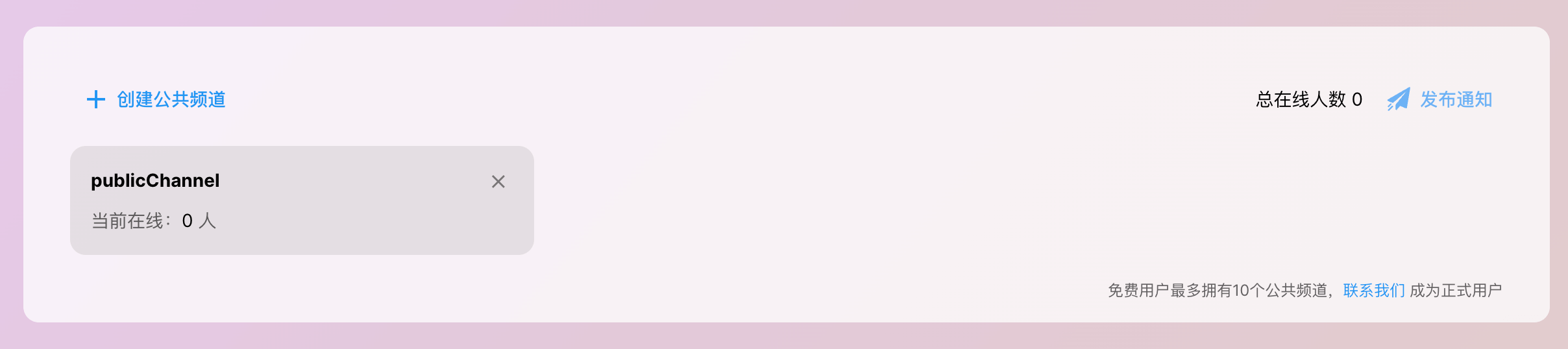 频道 是 UOS Push 系统中用于推送和收取信息最小单位,开发者需要预先配置公共频道。点击页面中的「立即创建」,在弹出的窗口中输入频道名称(不能重复)并点击「创建」即可。