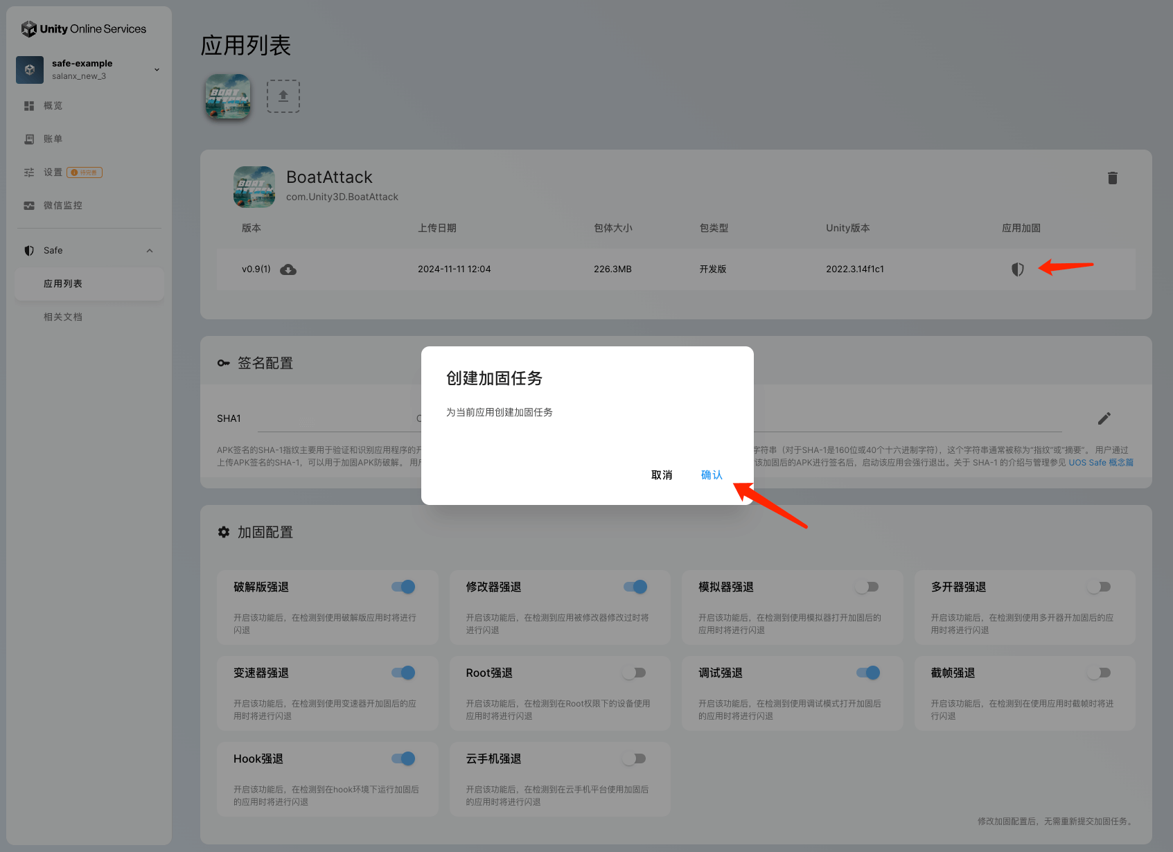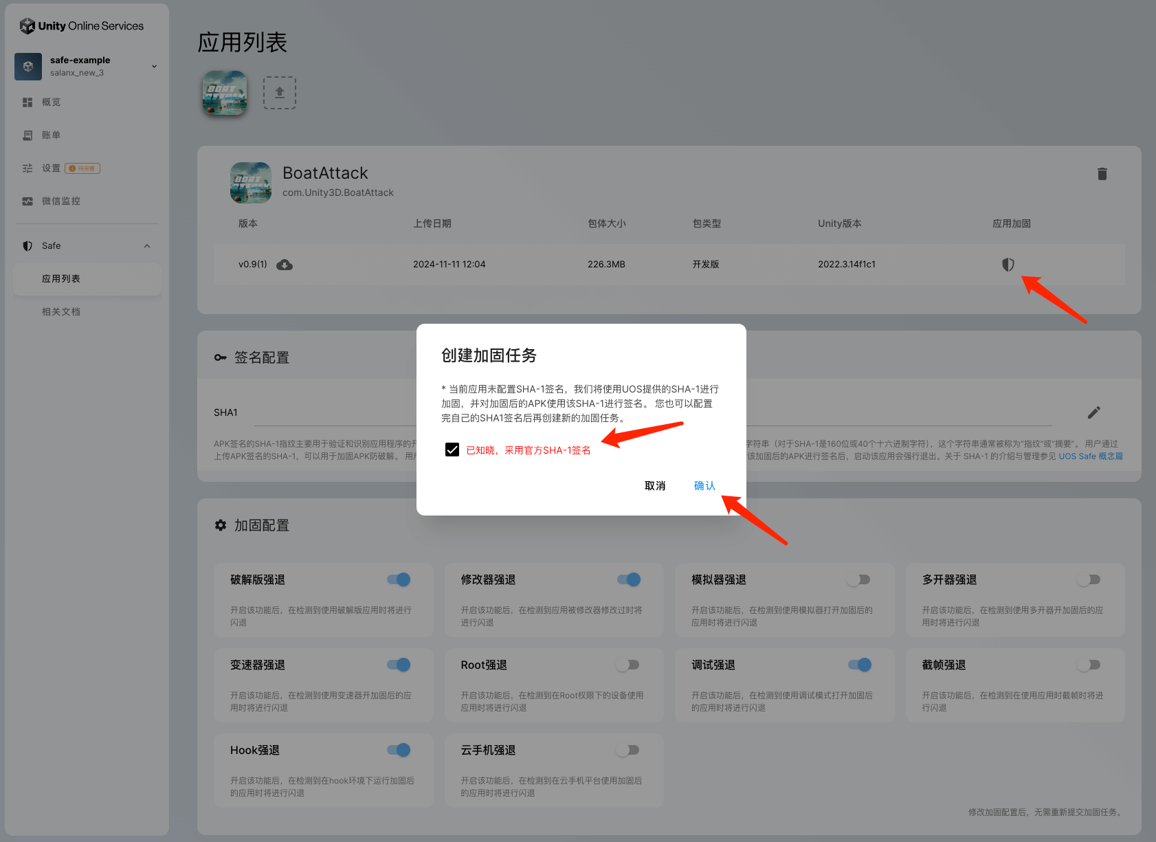 如果未配置SHA-1的话,您需要授权 UOS Safe 将使用UOS提供的官方SHA-1对该包体创建加固任务。