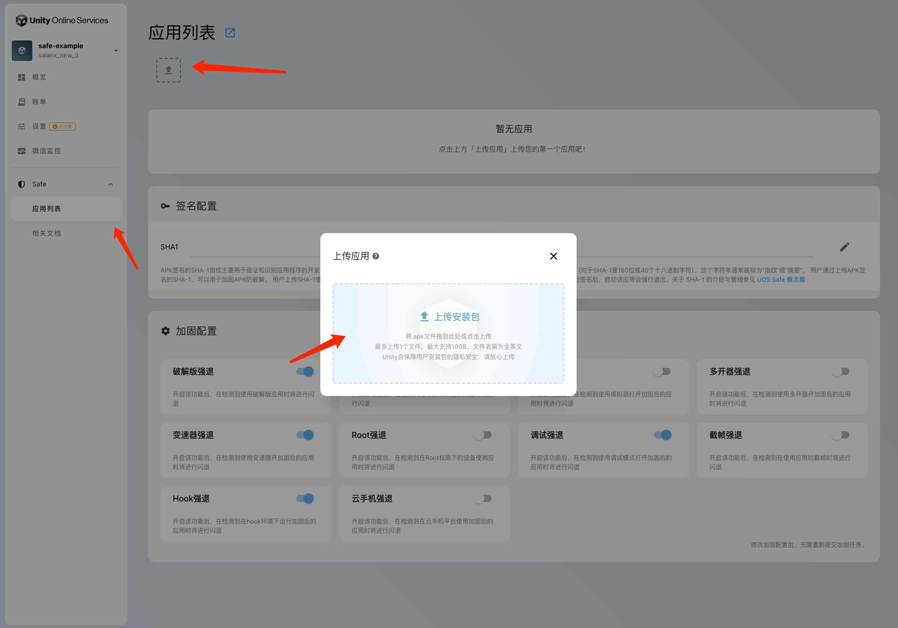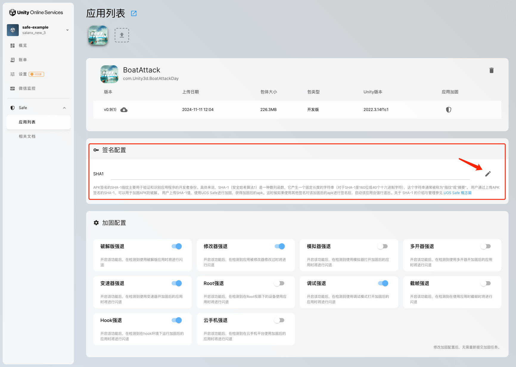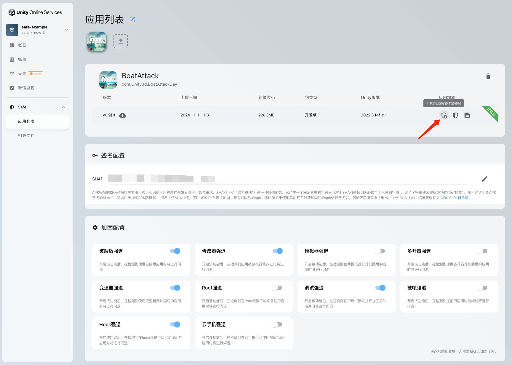 在创建加固任务前,先在签名配置中编辑并保存您的SHA-1。