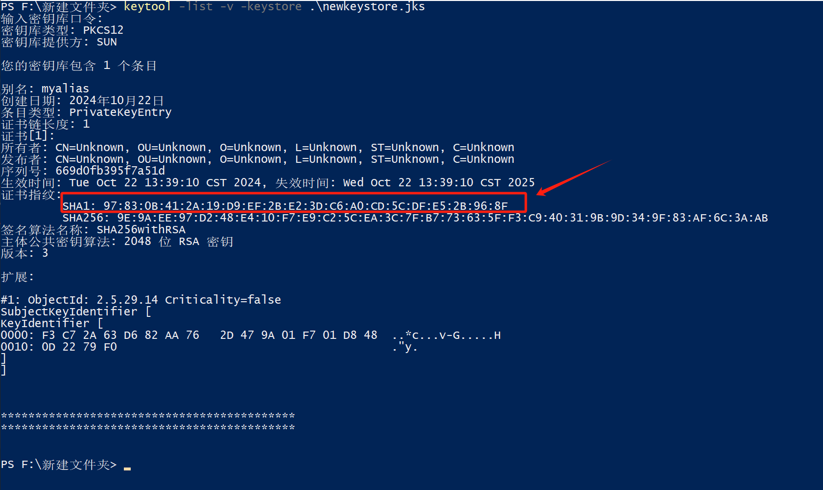 keytool -genkeypair -alias <alias名称> -keyalg RSA -keysize 2048 -validity 365 -keystore <签名文件>在已有签名证书的情况下,可以通过以下指令查看证书的 SHA-1 摘要: