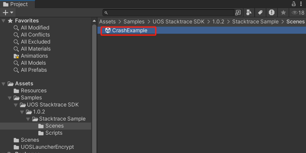 导入资源包后,在 Assets/Samples/UOS Stacktrace SDK/X.Y.Z/Stacktrace Sample/Scenes/CrashExample.unity 路径下(其中 X.Y.Z 为已安装的 Stacktrace SDK 的版本号),可以看到示例的 SampleScene 场景并打开。