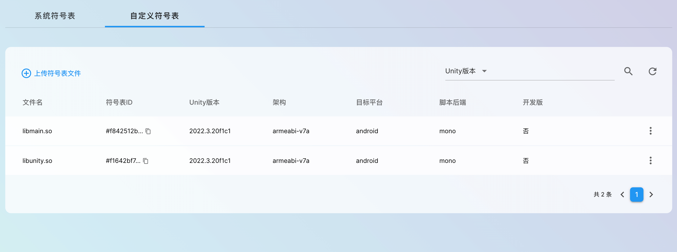 点击 UOS Stacktrace 面板上的 「Click to view uploaded custom symbols」 会跳转到 UOS Stacktrace 应用的自定义符号表管理界面,在这里可以查看已上传的符号表文件。