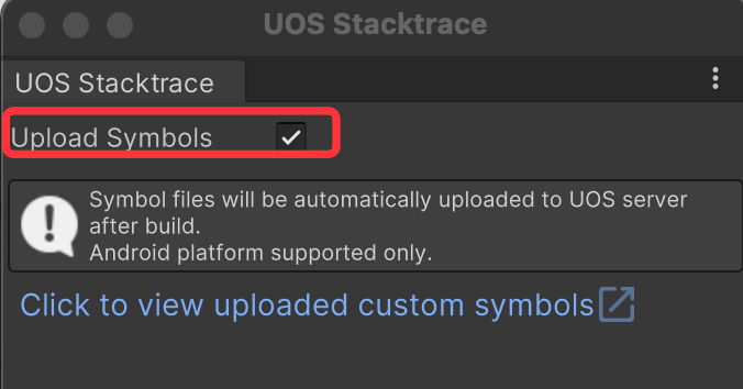 在 Unity Editor 菜单栏中打开 「UOS->Stacktrace->Open Panel」,可以通过勾选框 Upload Symbols 选择是否在生成安卓apk的同时上传相关的逻辑和引擎符号表文件。