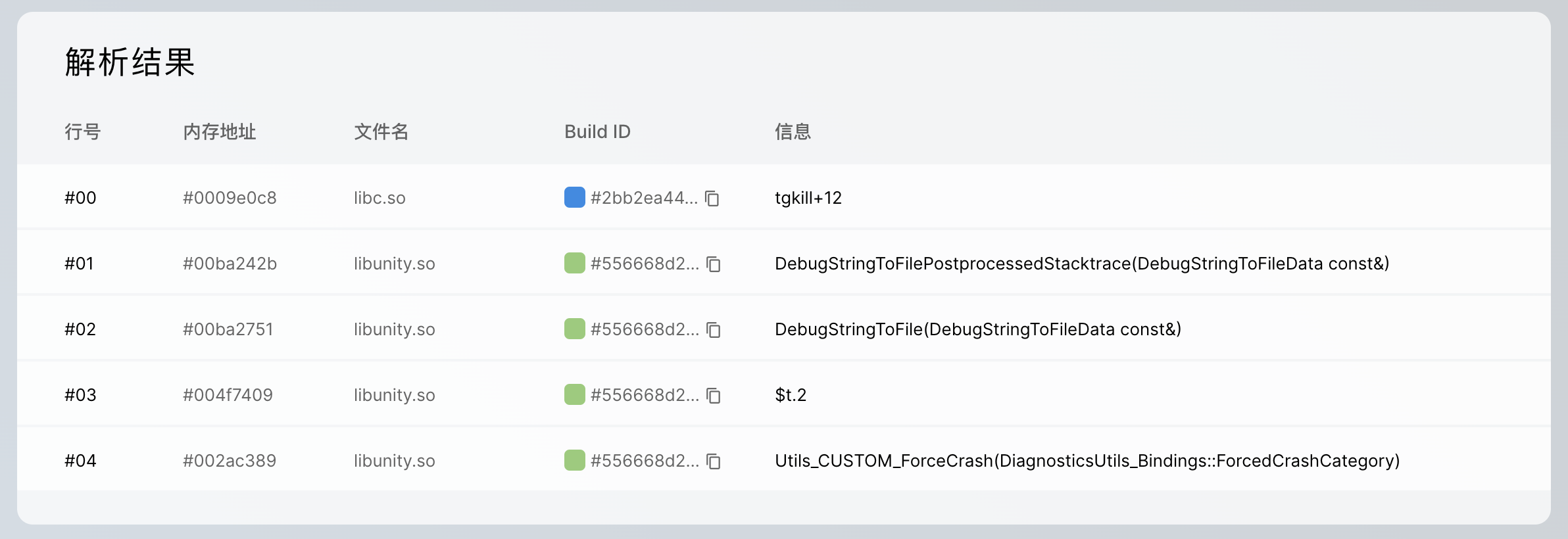 调试信息文件。每个符号表拥有唯一ID,如果上传的符号表ID与之前的相同,系统将默认覆盖原有符号表。在还原堆栈时,会根据ID匹配符号表。