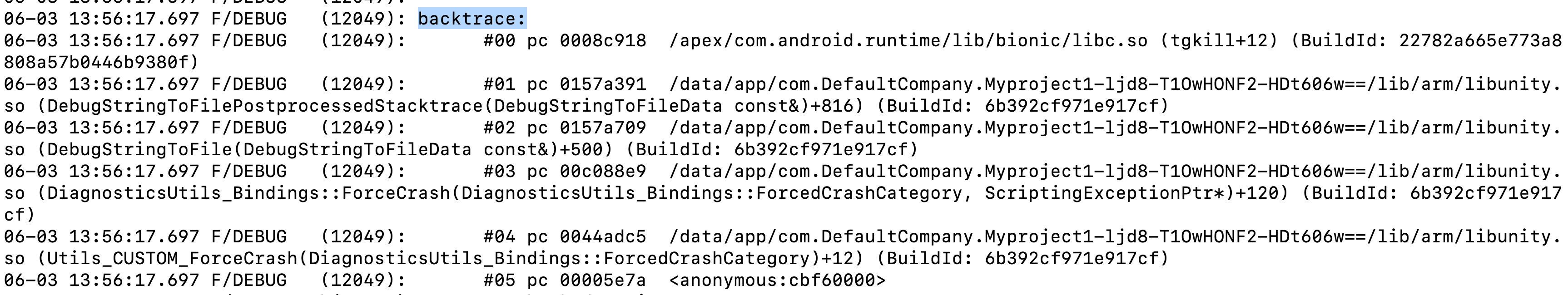 在命令行中按 「ctrl + c」 停止logcat,在打印出的logcat日志中搜索 backtrace 。