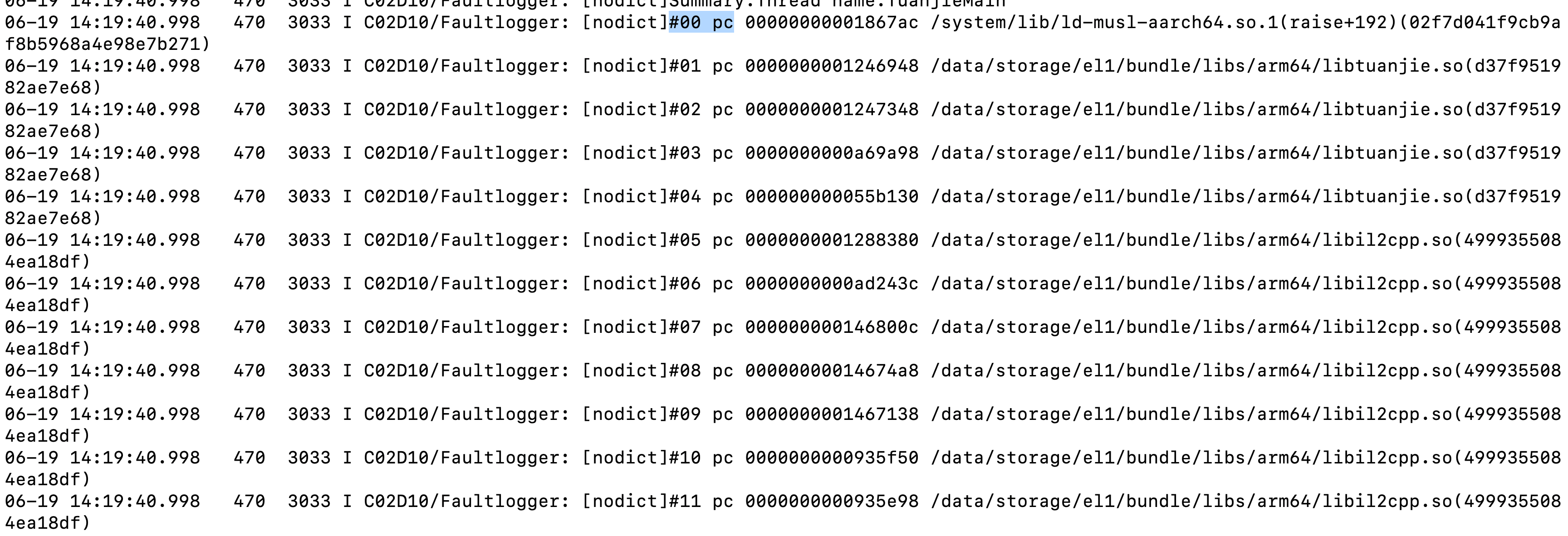 - 在命令行中按 「ctrl + c」 停止hilog,在打印出的hilog日志中搜索 #00 pc,找到最新的一条。