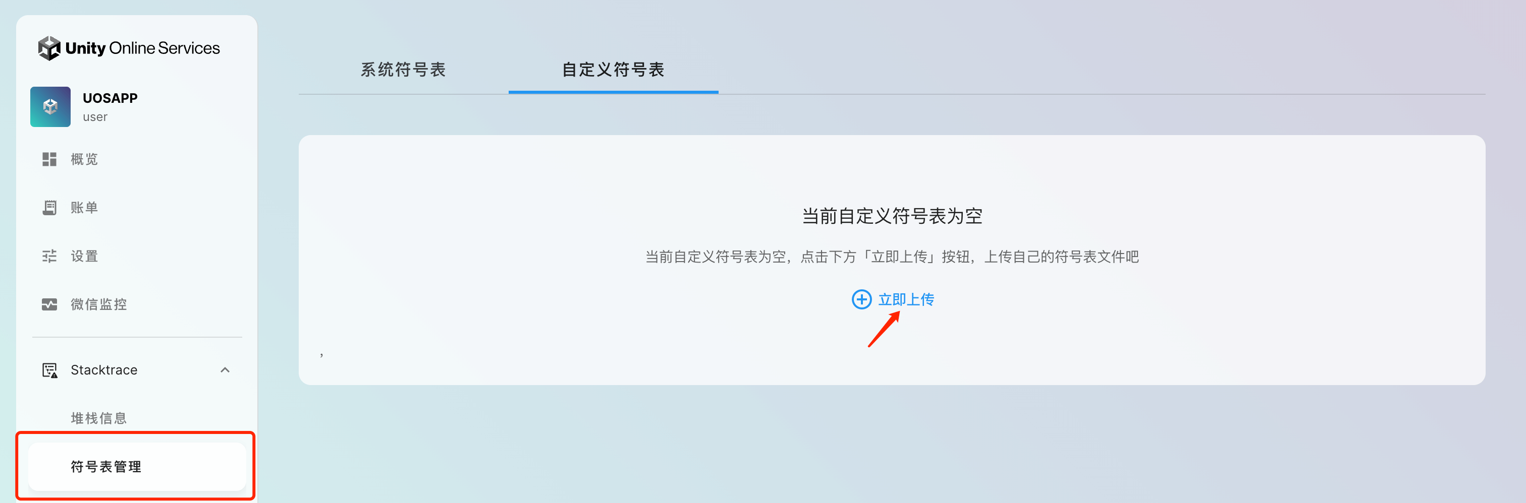 如果您需要使用自己的符号表文件,可进入 「Stacktrace -> 符号表管理」 页面,并点击「立即上传」: