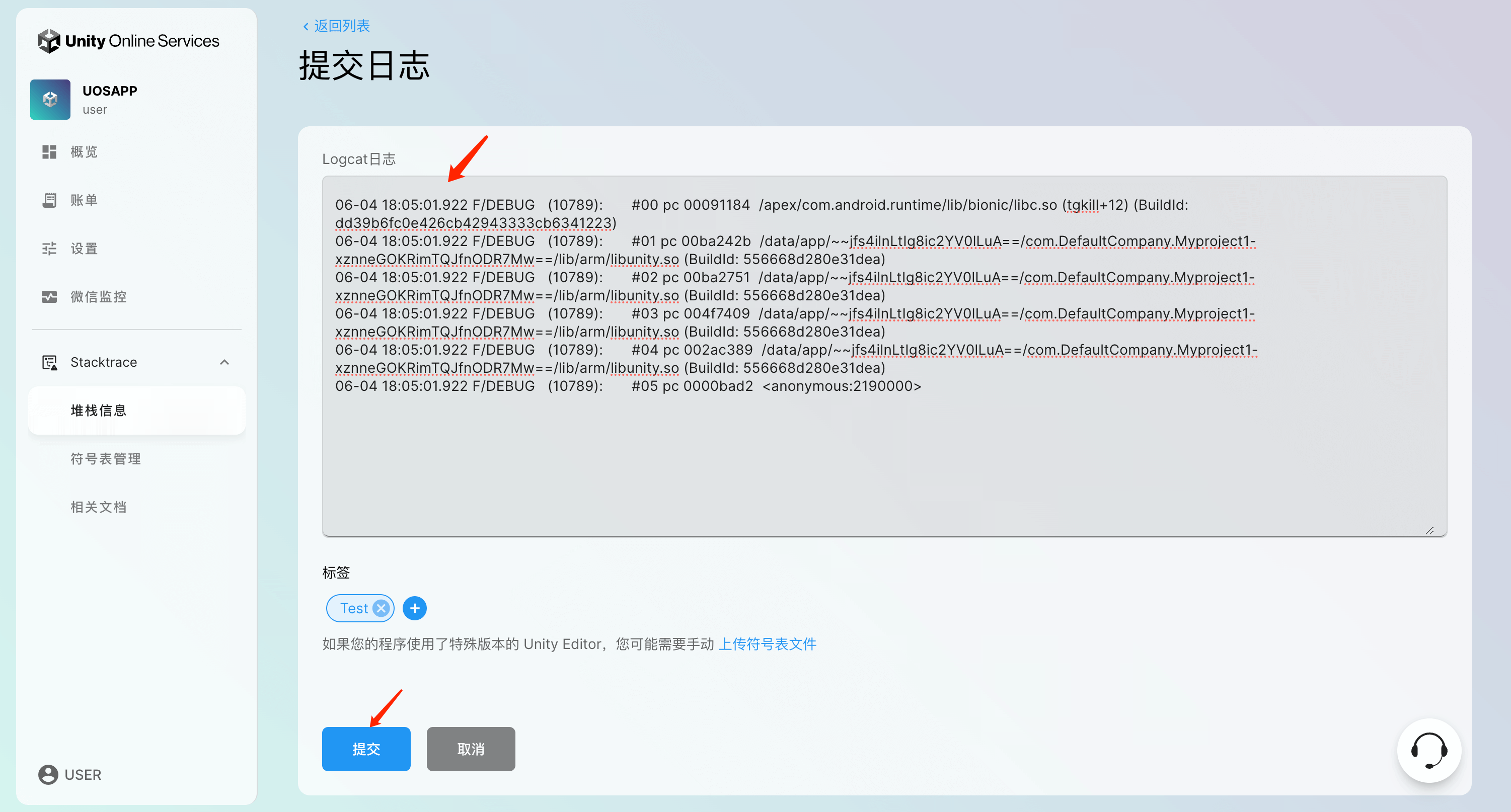 在 「堆栈信息」 点击「立即提交」进入日志提交页面,将你的崩溃堆栈日志(如何获得崩溃日志)粘贴到文本框中(可复制下方的示例日志),如有需要可以添加标签,点击「提交」等待解析完毕: