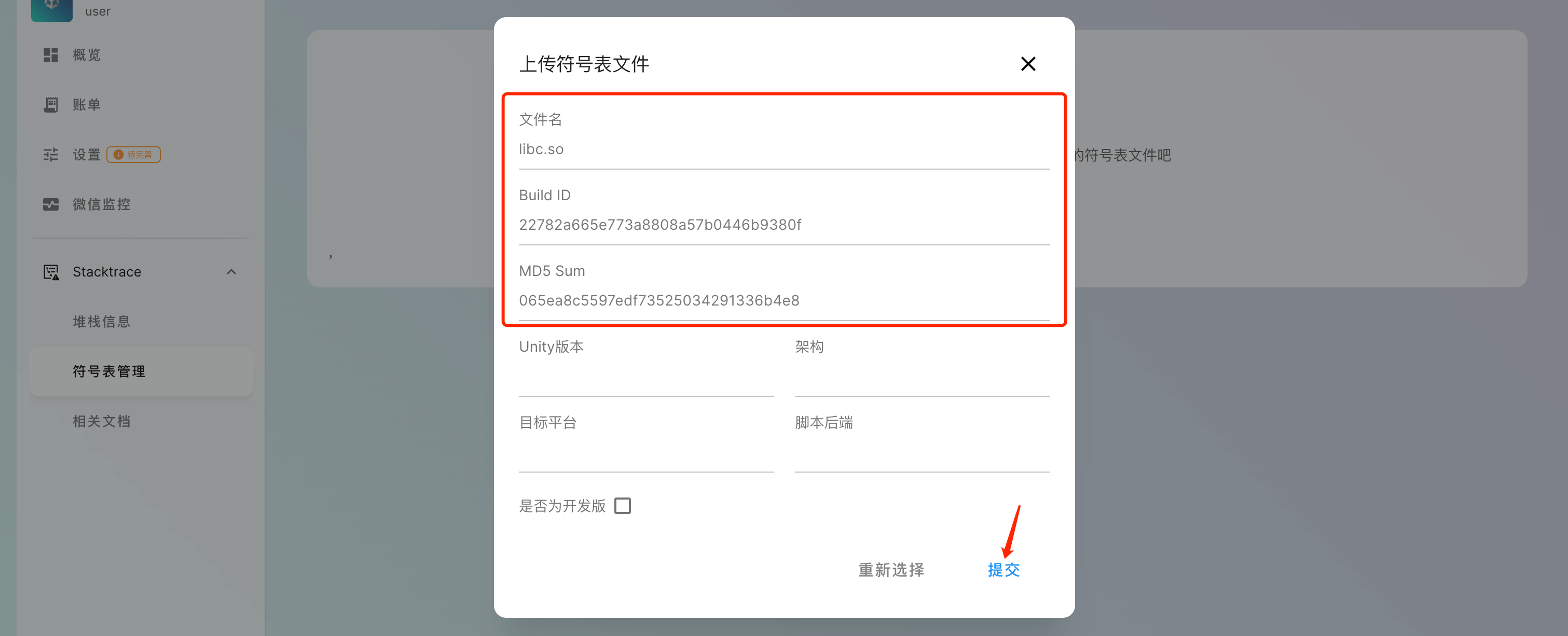 系统将根据您上传的符号表文件计算出Build ID和MD5值,Unity版本、架构、目标平台、脚本后端、是否为开发版可以选填以便区分管理: