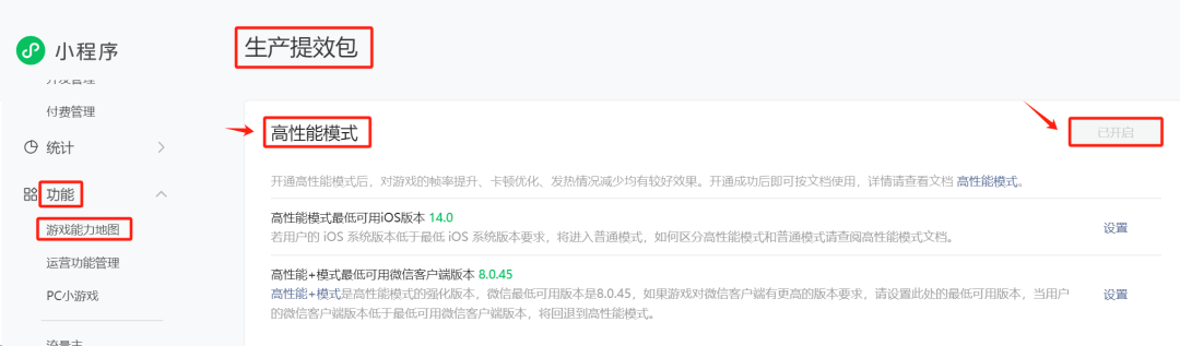当在 iOS 微信小游戏平台使用 KCP 协议时出现连接失败问题,请确认是否已在微信小程序管理页面开启高性能模式。由于在 iOS 设备上运行微信小游戏需要开启「微信高性能模式」,开启该模式的具体步骤为:登录微信小程序页面,依次选择「功能 → 游戏能力地图 → 研发能力 → 生产提效包 → 高性能模式」,最后点击「开通」按钮。