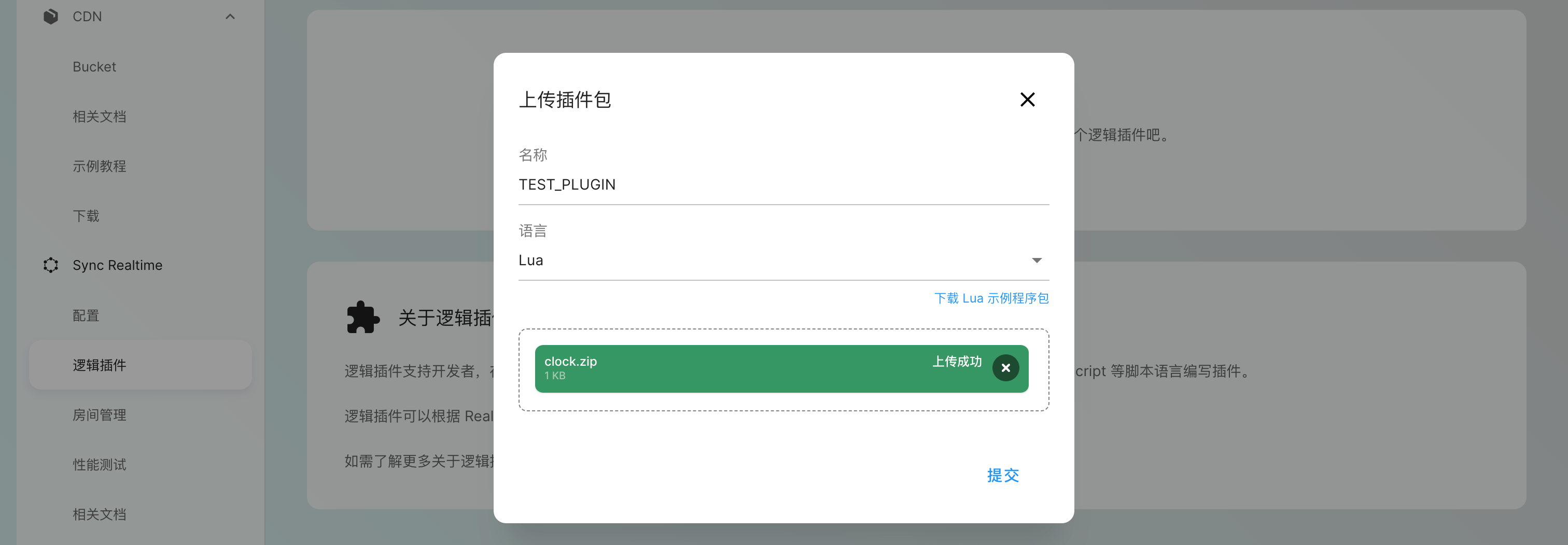 点击创建逻辑插件,上传插件的Zip压缩包。填入名称,选择插件类型,并提交。