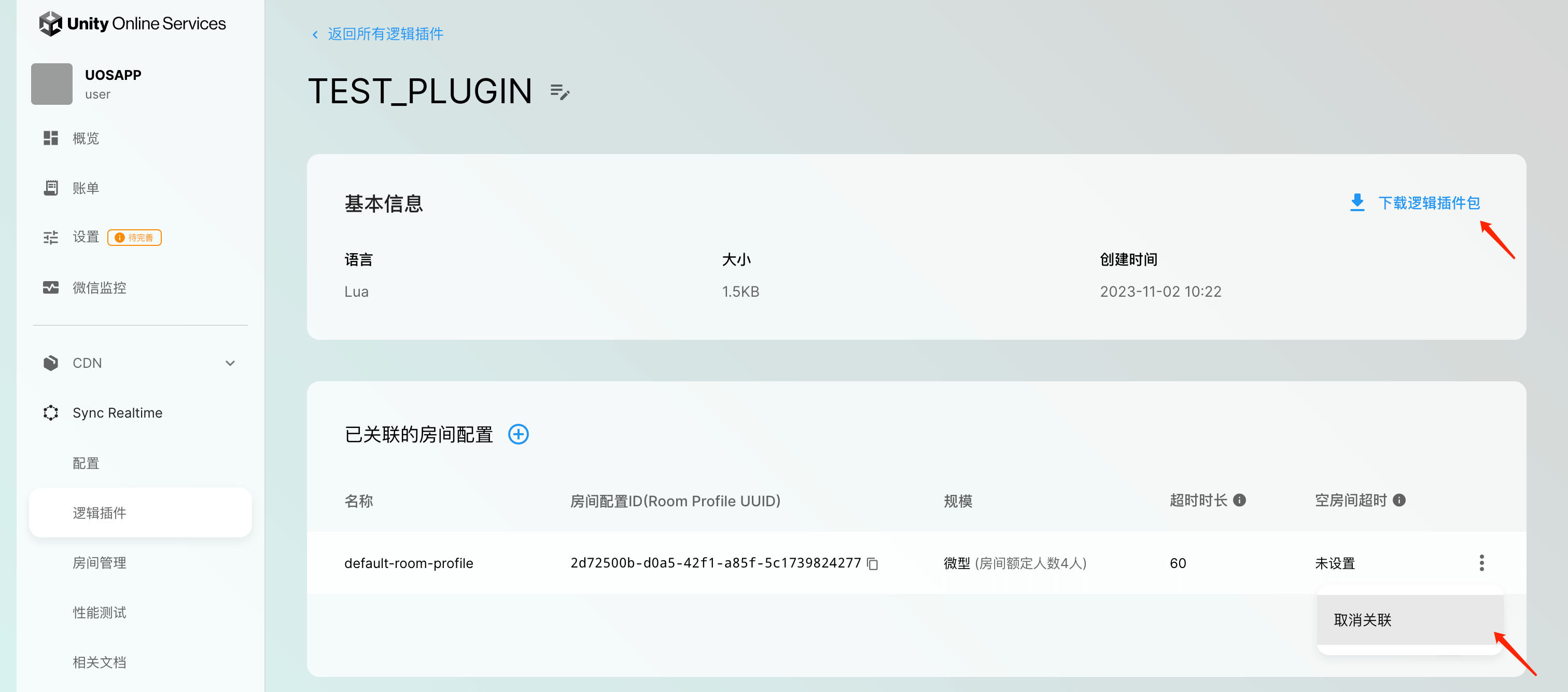 点击插件名称,进入逻辑插件详情页,在此页面可以查看逻辑插件的基本信息、已关联的房间配置列表(可以在该列表关联新的房间配置或者取消关联),以及支持修改逻辑插件名称和下载上传的Zip包。