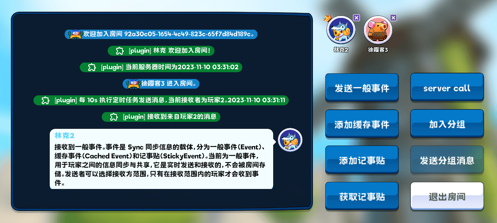 在线体验版本将使用「最近访问的应用」的第一个房间配置创建房间,关联的逻辑插件向会发出如下带有[plugin]前缀的信息。