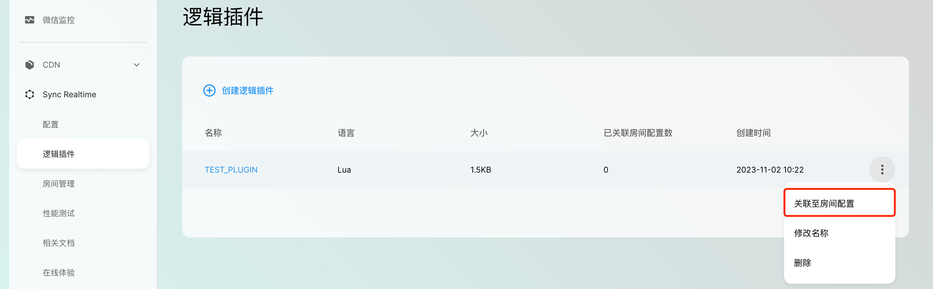 点击具体逻辑插件的「关联至房间配置」,并在弹窗中选择需要关联的房间配置,点击「关联」即可。