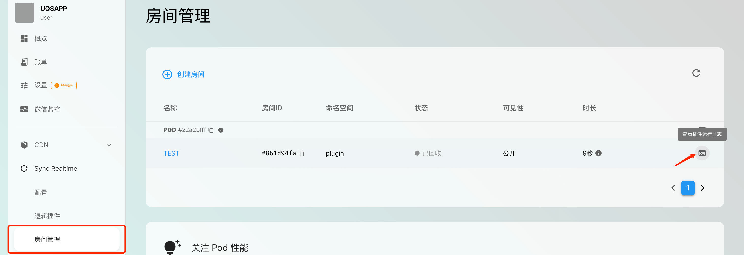 在「房间管理」页面,若该房间所用的房间配置绑定了逻辑插件,即可点击按钮查看插件运行日志,在房间详情页面也可查看。