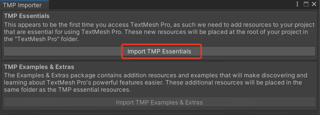 打开场景后,在弹出的窗口中,点击「Import TMP Essentials」来导入 TextMeshPro 的字体资源。