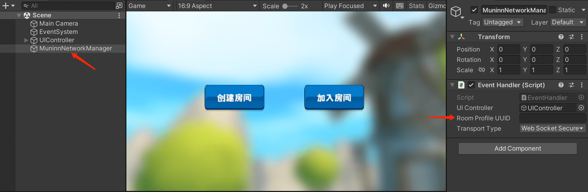 打开场景后,填写 MuninnNetworkManager 游戏对象中 RoomProfileUUID 信息。点击运行项目,创建房间。