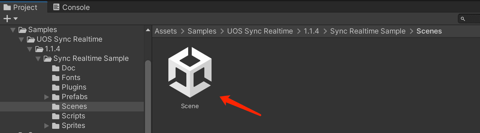 导入资源包后,在 Assets/Samples/UOS Sync Realtime/X.Y.Z/Sync Realtime Sample/Scenes/Scene.unity 路径下(其中 X.Y.Z 为已安装的 Sync - Relay SDK 的版本号),可以看到示例的 SampleScene 场景并打开。